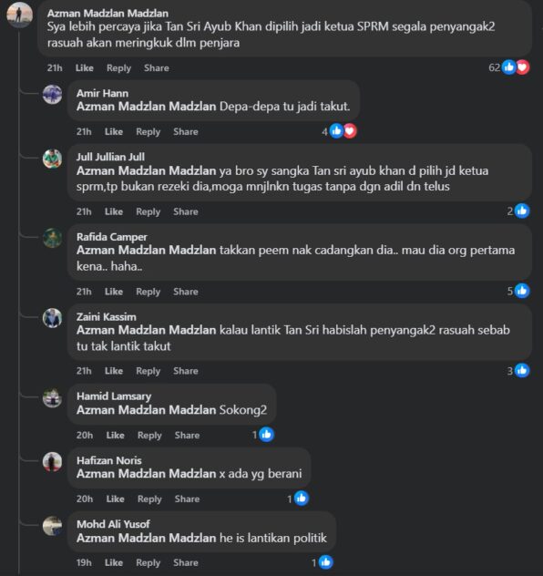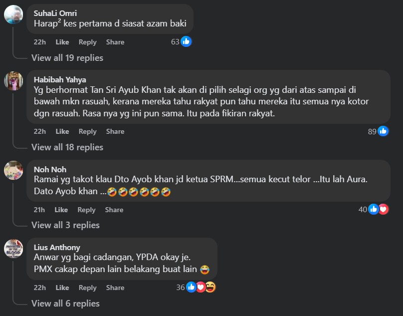 As highlighted in the Friend Dato Ayob Khan Mydin Pitchay FB group, it seems that many man-on-three-street Malaysians have expressed confidence that “all the corrupt crooks will languish in jail” should Ayob be appointed to helm the MACC.