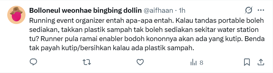 This is the result of a recent run, undoubtedly participated by health conscious Malaysians who also happen to be not so environmentally conscious.