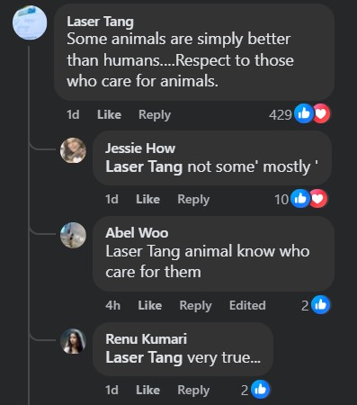 Encapsulating the overall sentiment though was a comment that hit the nail on the head. It simply declared that “some animals are simply better than humans … Respect to those who care for animals”.