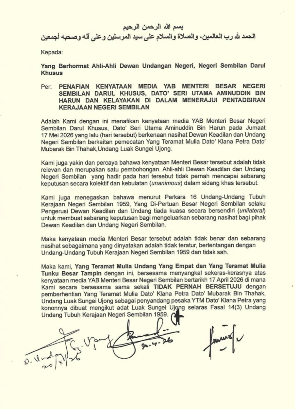 In a letter yesterday, the Undang Yang Empat - together with another state chieftain, the Tunku Besar Tampin - called for the members of the Negeri Sembilan state assembly to remove Aminuddin from office.