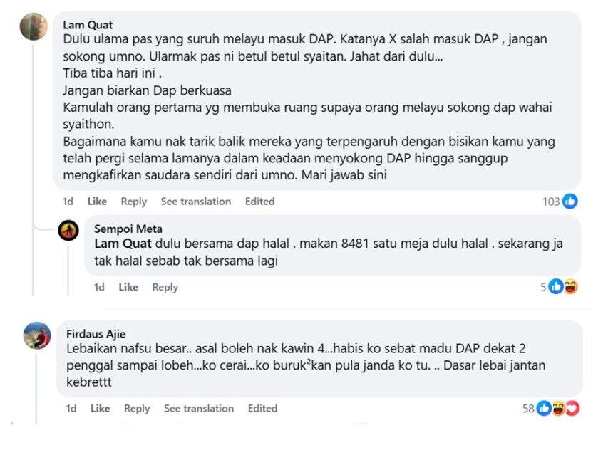 This inconsistency was also pounced upon by one seemingly confused commenter who asked about the status of other “kafir (infidel) parties” such as Gerakan within the opposition block.