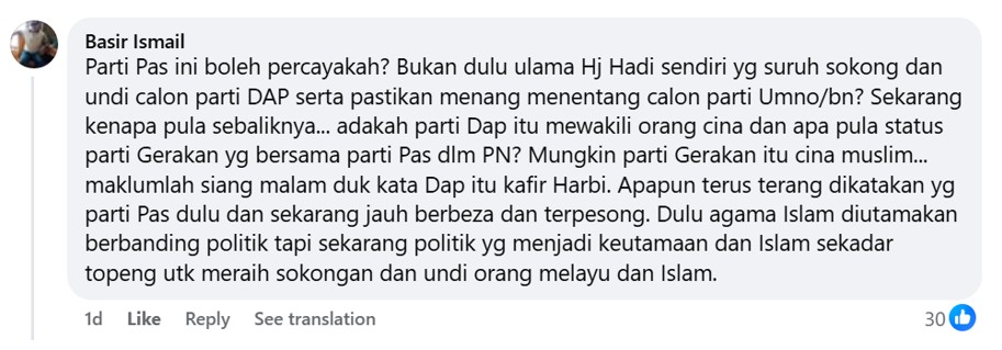 The sheer hypocrisy of the FB proclamation was highlighted by several unimpressed commenters who reminded PAS supporters that once upon a time, the Islamist party was in cahoots with the DAP.