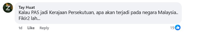 “If PAS becomes the government, what will happen to Malaysia. Think about it,” said Tay Huat.