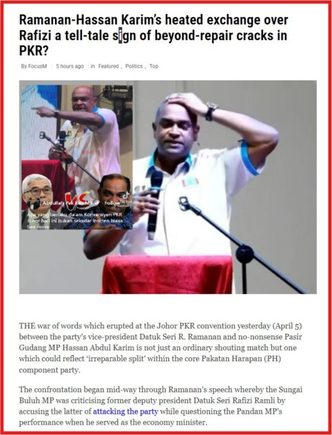 In case anyone is not up to date on domestic politics, there has been a widely reported split within the PKR camp between Ramanan and former party deputy president Datuk Seri Rafizi Ramli.