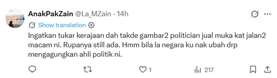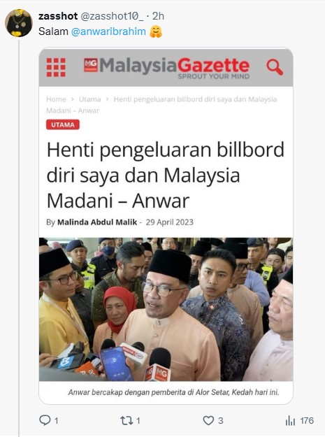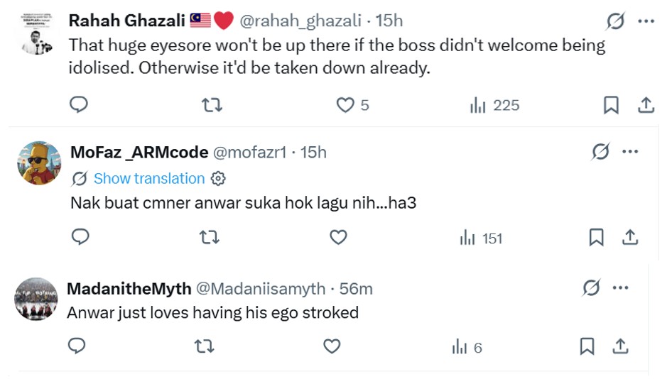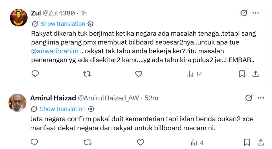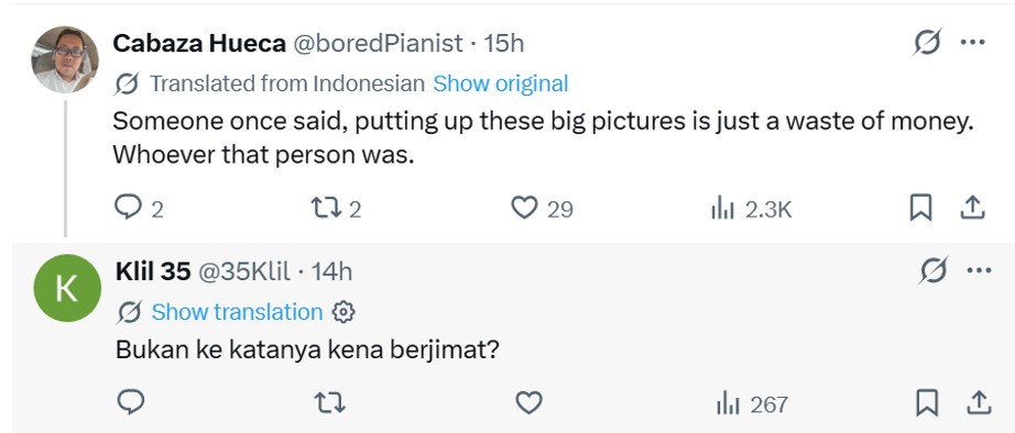 One commenter sarcastically reminded that a certain unnamed person – alluding to PMX – had previously declared that such billboards were a waste of public funds and that such practice should be consigned to the dustbin while another highlighted the reminder for Malaysians to be frugal (in light of current global energy crisis).