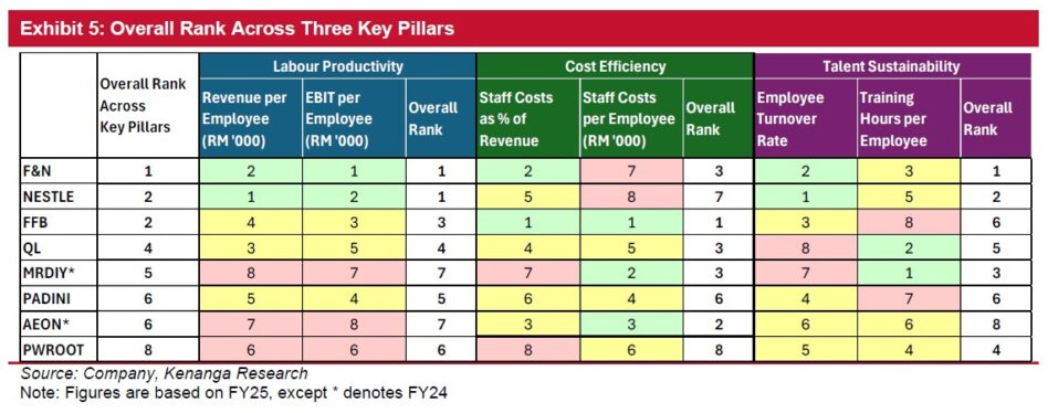 Companies that effectively balance labour productivity, cost efficiency and talent sustainability, such as F&N, NESTLE and FFB, are leading in workforce efficiency and are better positioned to manage wage inflation and sustain earnings, while retail-oriented players remain more constrained by higher labour intensity and turnover.