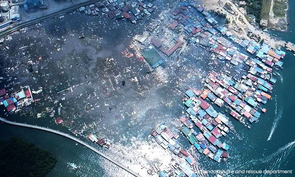 Yesterday, a major fire in the water village destroyed around 1,000 houses over an area of more than 4ha, with six temporary relief centres (PPS) opened so far. Following that, Sabah Chief Minister Hajiji Noor announced today an initial aid of RM2,000 to each head of household.