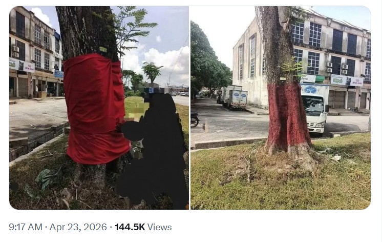 According to the post, a vigilante decided to remove a red cloth wrapped around the trunk of a tree in an undisclosed location. Note that the cloth is purportedly used to mark the tree as an entity for worshipping.
