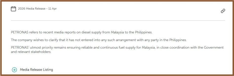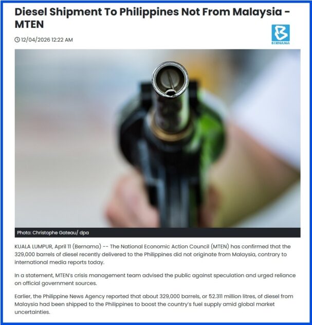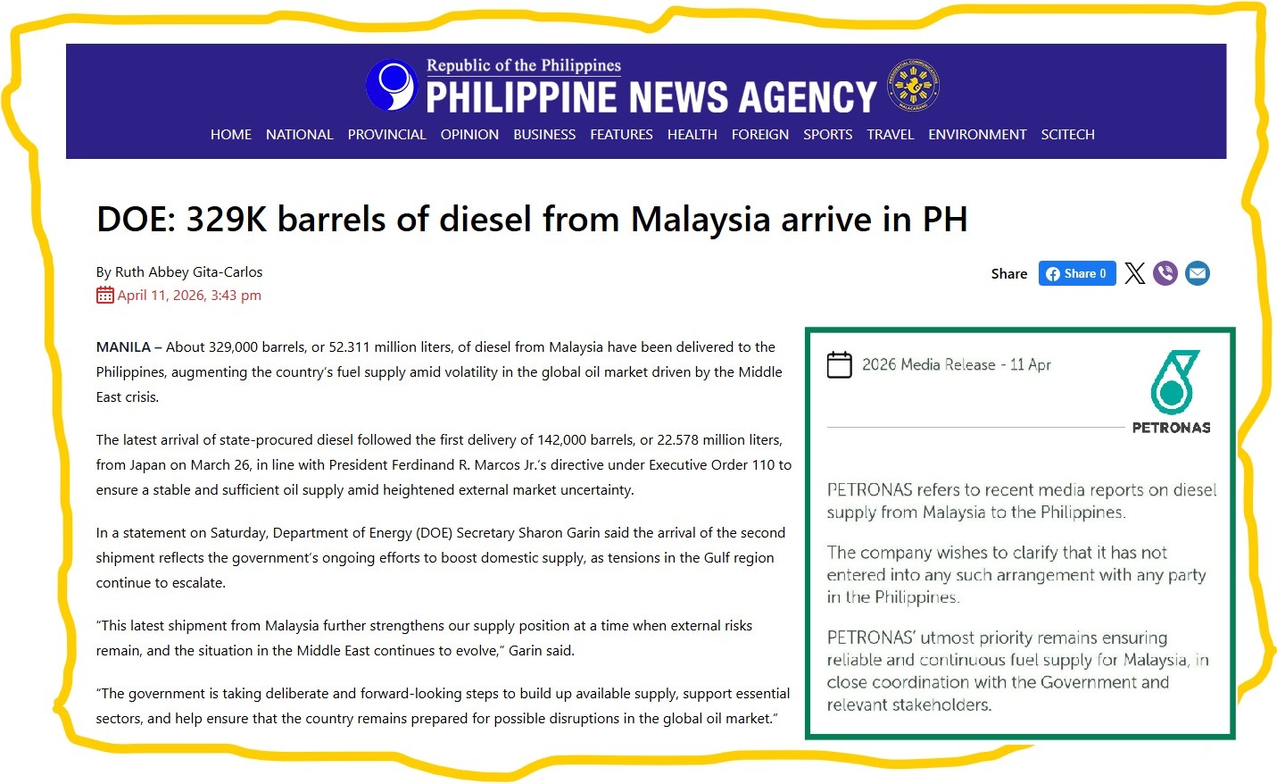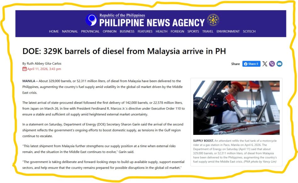 Apparently, PNA has run a statement yesterday (April 11) afternoon citing Department of Energy (DOE) Secretary Sharon Garin that the arrival of about 329,000 barrels or 52.311 million litres from Malaysia reflects Manila’s “on-going efforts to boost domestic supply as tensions in the Gulf region continue to escalate”.