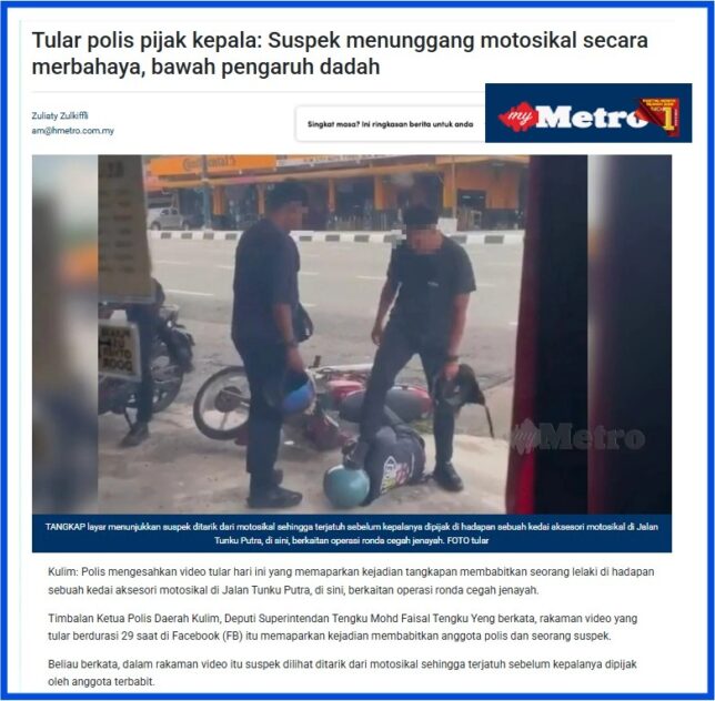 Interestingly though, the public has their own interpretation of the incident as the cyberspace was abuzz with outrage over the pijak kepala (stepping on the head) action by the police on the suspect as depicted by the 29-second clip.