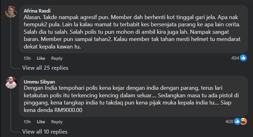 Kedah-based digital creator Khairull Fadzillah fired the first salvo by highlighting the fact that the suspect “didn’t fight back” yet the police resorted to pull him down from his bike before “stepping on his face”.