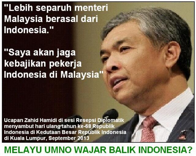 Menteri Dalam Negeri Malaysia Ahmad Zahid Hamidi mengungkapkan, lebih dari separuh dari total menteri di Malaysia adalah keturunan Indonesia. Dia pun menyebut betapa dekatnya hubungan antara kedua negara bertetangga ini."Hubungan dua negara luar biasa dekatnya dan Duta Besar Herman Prayitno juga luar biasa. Kami di Malaysia senang dengan beliau," kata Zahid pada Resepsi Diplomatik menyambut HUT ke-68 Republik Indonesia di Kuala Lumpur, Senin (2/9) malam.Salah satu menteri Malaysia keturunan Indonesia adalah Ahmad Zahid Hamidi, yang keturunan Jawa. Sejumlah menteri Malaysia lainnya ada yang berketurunan bugis, minang dan sejumlah suku di Indonesia.