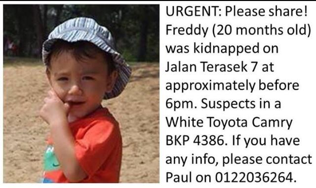 "My next-door neighbour's 20-mth-old baby Freddy, kidnapped just now in broad daylight in Bangsar," Surendran gave the alert on Twitter.