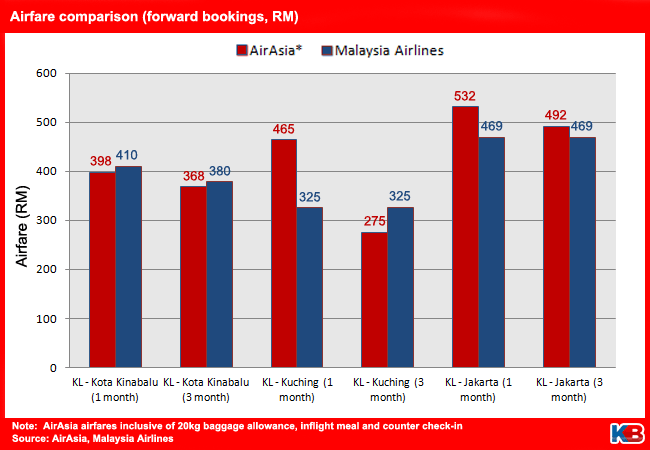 For a view on international flight prices Tiger looked at flights to Jakarta from Kuala Lumpur and found Malaysia Airlines consistently cheaper than AirAsia. Return fights for a month from today and three months from now both cost RM469 with MAS but equivalent itineraries at AirAsia cost RM532 and RM492 respectively. For Jakarta flights, Malaysia Airlines flights are cheaper even without factoring in baggage and an inflight meal to AirAsia’s ticket prices.