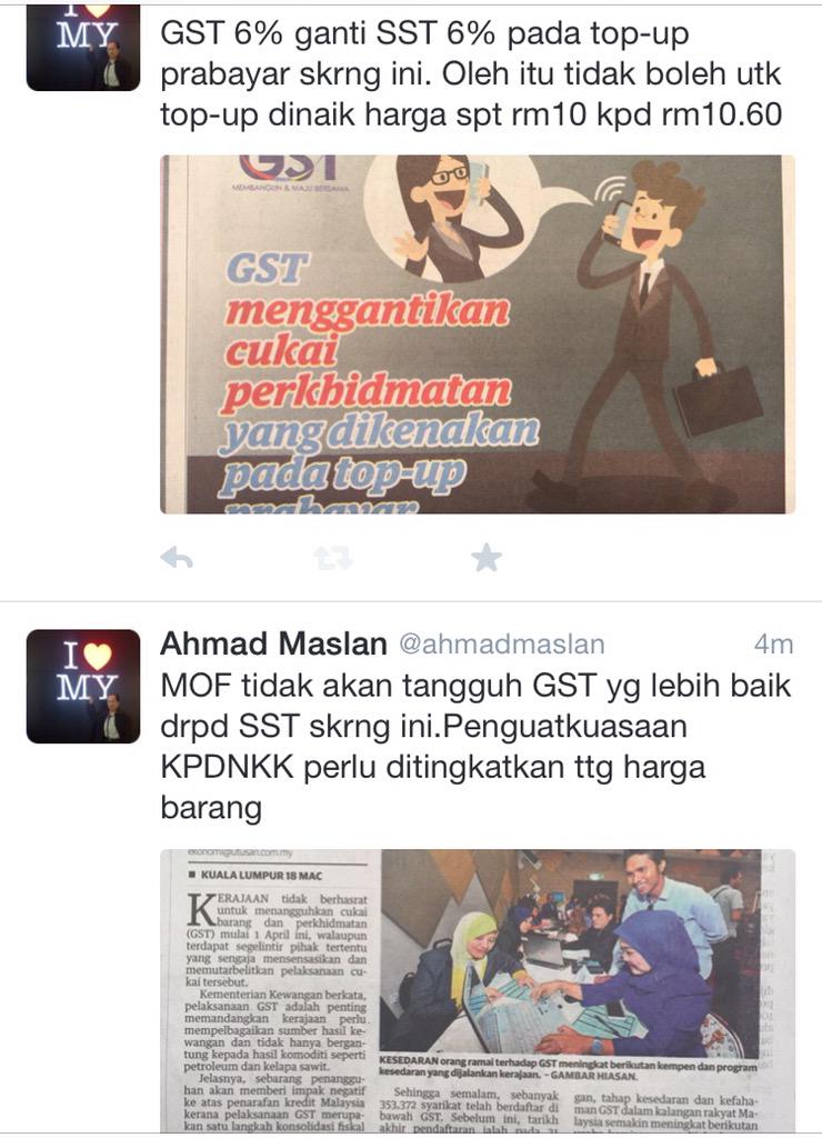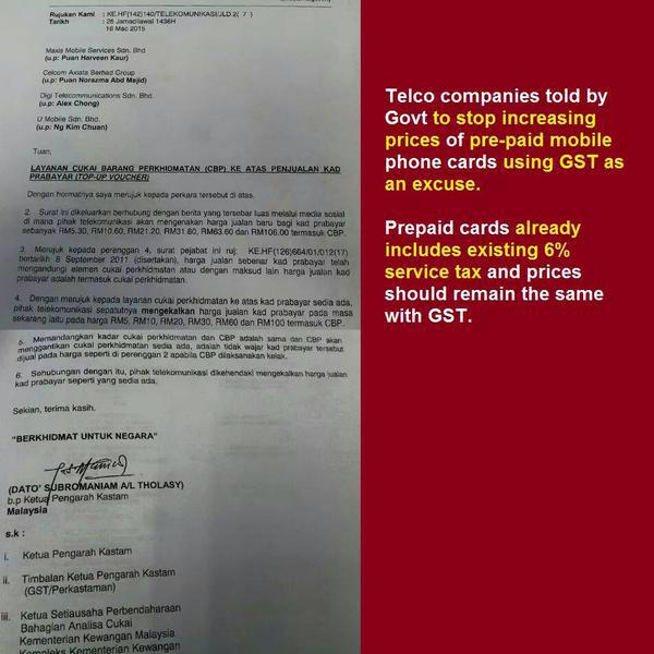 Sblm ini saya maklumkan top-up prabayar tak boleh naik dgn GST sbb top-up skrng dah ada SST 6%. Arahan telah diberi..