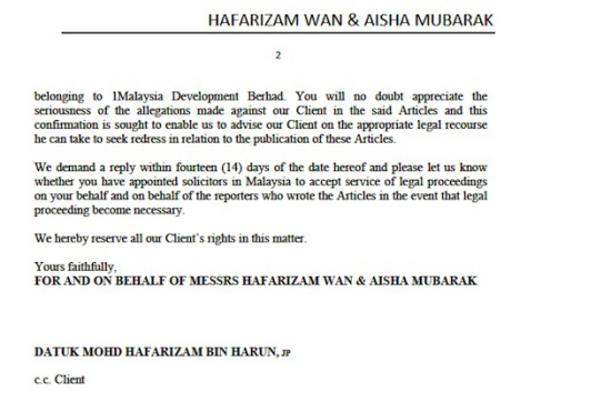 "Kami diarahkan untuk mendapatkan pendirian anda kerana artikel itu secara kolektif menyarankan bahawa anda tidak pasti tentang 'sumber asal wang itu dan apa yang berlaku kepada wang itu', manakala intipati umum artikel mewujudkan gambaran yang jelas bahawa pelanggan kami telah menyalahgunakan AS$700 juta milik 1MDB," kata surat yang dihantar melalui emel itu.