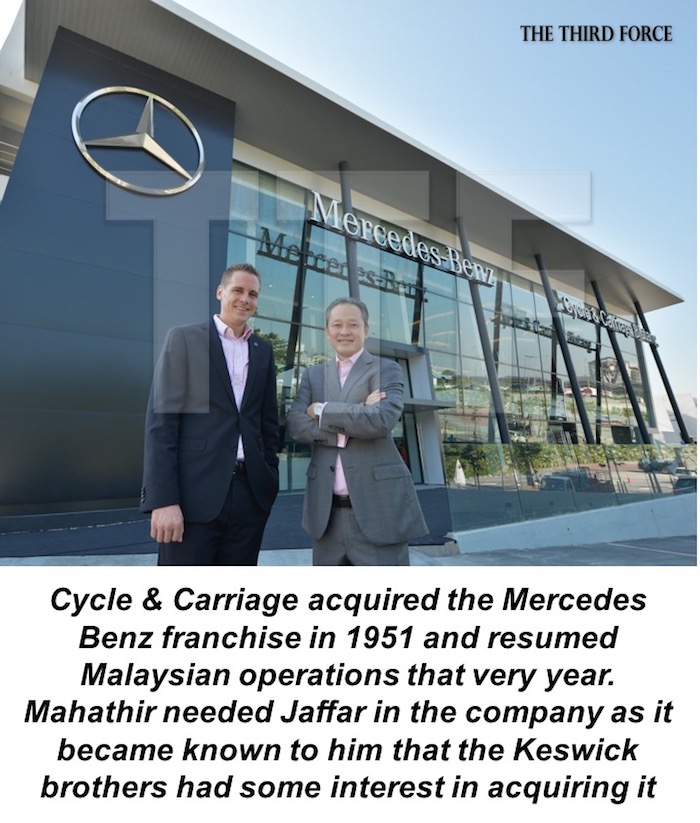 Now, it should interest you to know that Jaffar was also well connected with the Keswick brothers. Back then, Simon Keswick was the director of Jardine Matheson & Co. (JMC), the group that founded and owned the company David was invited to lead. JMC also owned a large chunk of the Hongkong and Shanghai Banking Corporation and had very close relations with the managers of CC Malaysia. Mahathir needed badly for Jaffar to take on a managerial post at the Mercedes Benz dealership.