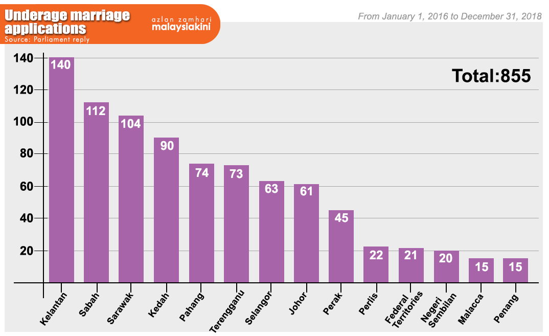 Kelantan recorded the most number of underage marriage applications made through the syariah court, with 140 submissions received from Jan 1, 2016 to Dec 31, 2018.