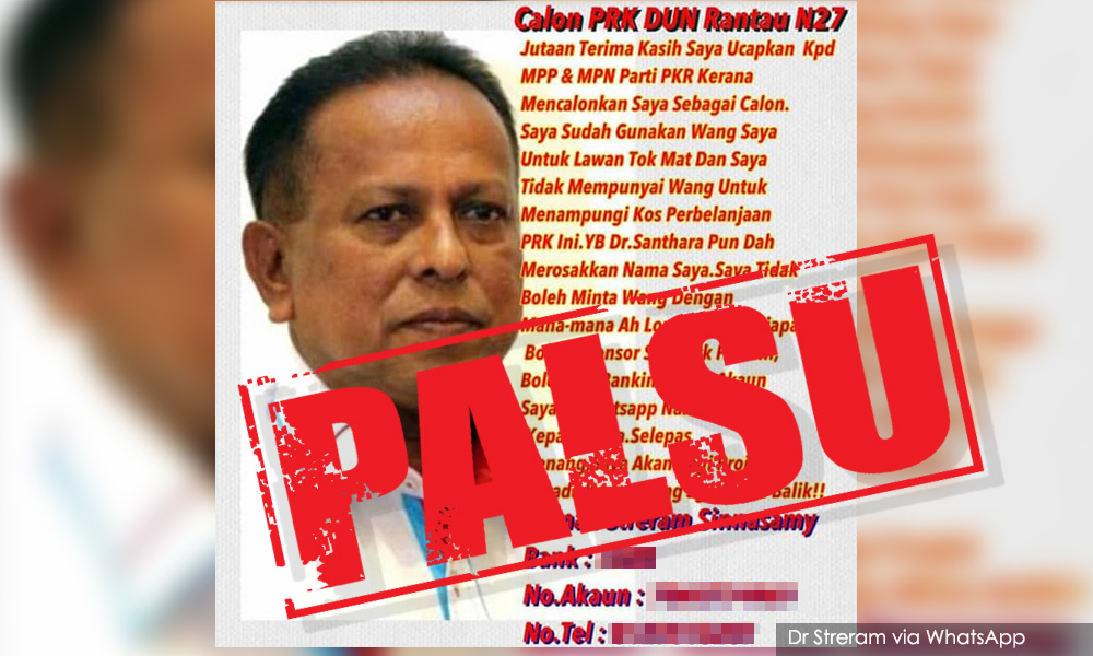 The day Streram was announced as the Harapan candidate for Rantau, he received another shocker. This time, it was a social media message claiming he was seeking public donations to contest.