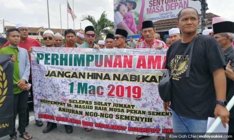 A group of NGOs staged a protest at a mosque in Semenyih after Friday prayers, pledging to defend Prophet Muhammad with their "last drop of blood".