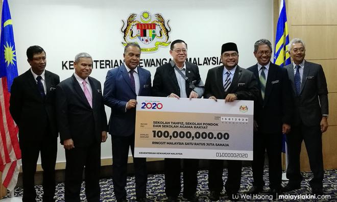 On Wednesday, Finance Minister Lim Guan Eng handed over RM100 million to de facto Religious Affairs Minister Mujahid Yusof Rawa for upgrading and maintaining tahfiz schools (RM50 million), Sekolah Agama Rakyat and Persendirian (RM25 million), and registered Pondok Schools (RM25 million).