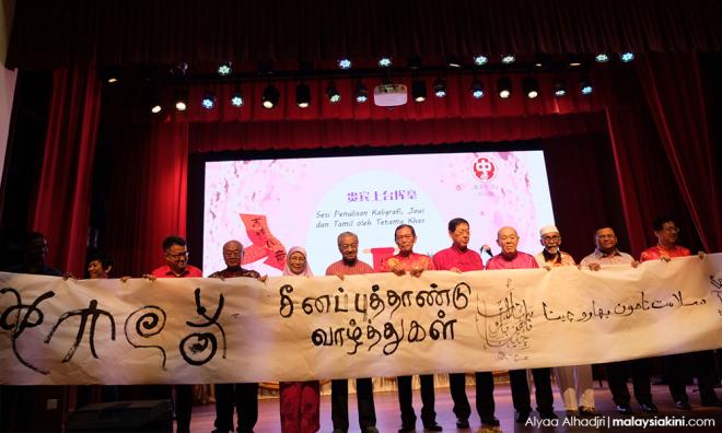 From one end of the stage to the other, Prime Minister Dr Mahathir Mohamad, alongside other Pakatan Harapan leaders, held a stretch of white paper with "Selamat Tahun Baru Cina" written in Jawi characters, khat, and the Tamil script.