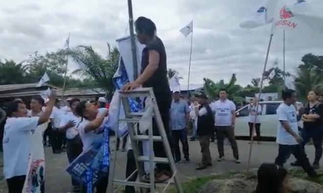 The video allegedly shows a man climbing up a ladder to take down BN posters and several people were assisting him.