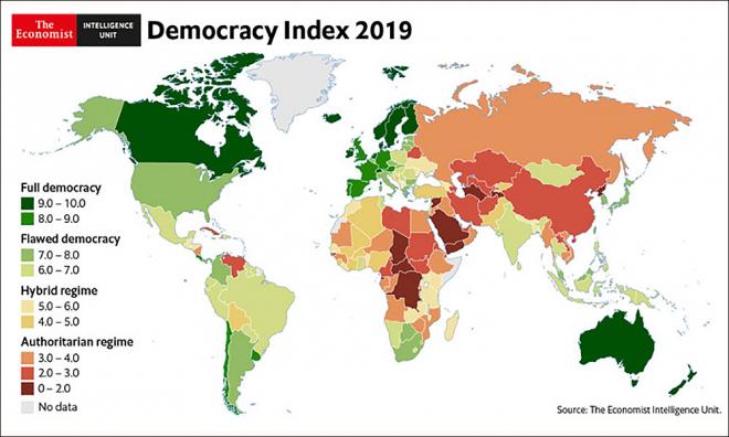 Countries with a score higher than eight are placed in the "full democracy" category while countries with a score of between six to eight are placed in the "flawed democracy" category.