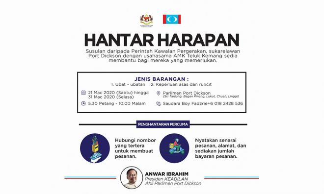 CORONAVIRUS | Port Dickson MP Anwar Ibrahim has announced his centre will be distributing face masks and sanitisers to constituents and will be offering free delivery service for groceries and medical supplies.