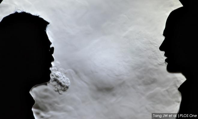 Some good work done on real-time imaging of human exhaled airflows shows that when two persons are having a normal conversation, their exhalation airflows overlap and interact (as we well know). The airflow is spread even further when someone is coughing, sneezing or laughing.