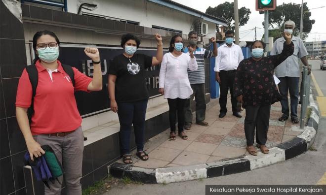 They gathered outside the Raja Permaisuri Bainun Hospital in Ipoh yesterday to protest against union-busting tactics by the cleaners' employer Edgenta UEMS.
