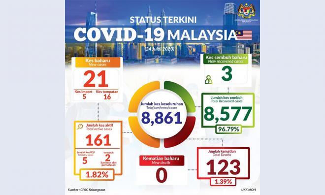 "As of noon July 24, 2020, there were 21 new cases reported. This brought the cumulative number of Covid-19 positive cases in Malaysia to 8,861.
