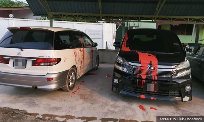 Two Toyota vehicles belonging to Terengganu state executive councillor Satiful Bahari Mamat were damaged after being splashed with red paint in an incident early Sunday.