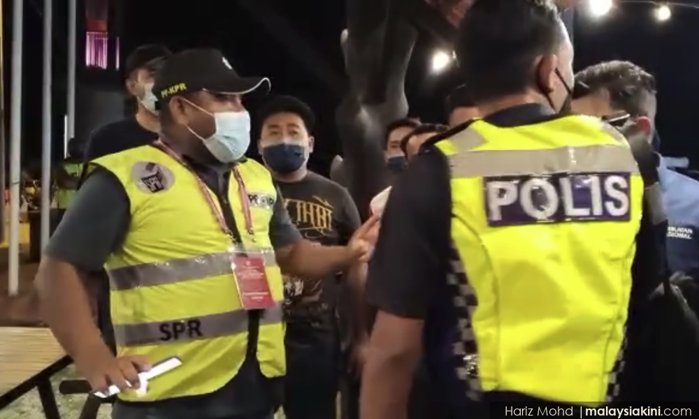The group were wearing caps with the label "PP-KPR" which stands for "Pasukan Penguatkuasa Kempen Pilihan Raya" (election campaign enforcement team).