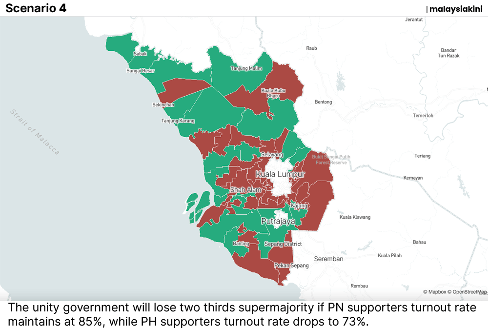If the supporter turnout for PN is 15 percent lower than in GE15 while the supporter turnout for Harapan is 30 percent lower, then the latter will face the worst-case scenario by obtaining only 36 seats and losing a two-thirds majority in the state legislative assembly.