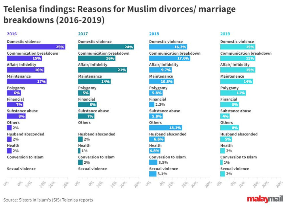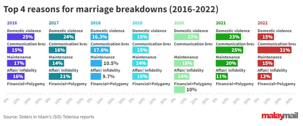 In its latest report, SIS recorded the top four reasons cited by Muslims who used its free legal aid service Telenisa in 2022 on why they divorce, with communication breakdown being the most common reason at 31 per cent.