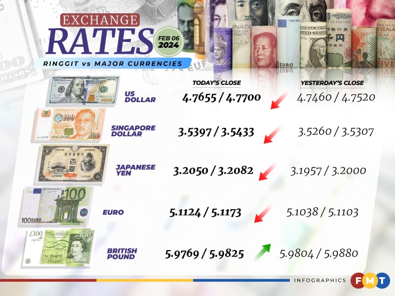 At 6pm, the ringgit fell to 4.7655/4.7700 against the greenback from yesterday’s close of 4.7460/4.7520.