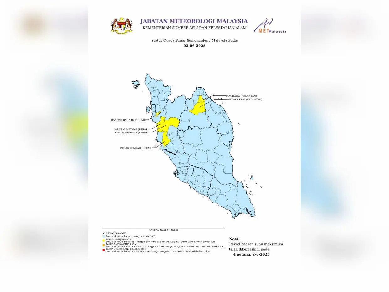 For more information and the latest status of daily hot weather, the public can visit MetMalaysia's official portal at https://www.met.gov.my/iklim/status-cuaca-panas.