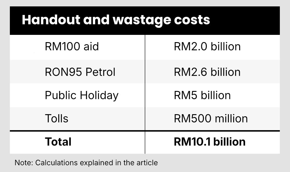This is evident with the latest ill-advised handouts and wastage, which I estimate at over RM10 billion (see table below), to ingratiate himself with the public.