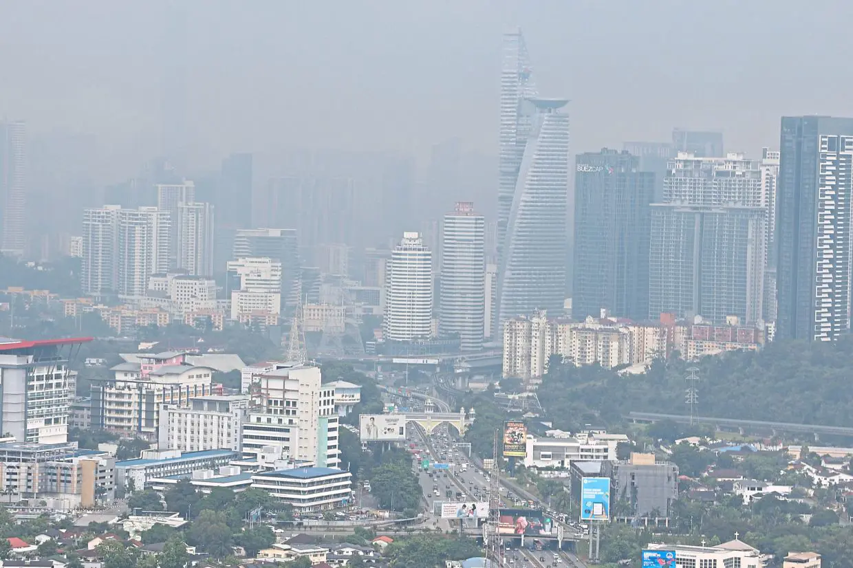 Veil of grey: A photo taken around 1.30pm shows worsening haze conditions along the Federal Highway between Petaling Jaya and Bangsar. The Kuala Lumpur city skyline, usually visible in the background, is completely obscured by the dense smog, highlighting the seriousness of the air pollution. — ART CHEN/The Star