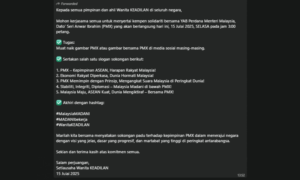 On July 16, PKR Women secretary Sangetha Jayakumar launched a digital campaign to boost her boss Anwar Ibrahim's public image and for party members to express support for their leader.