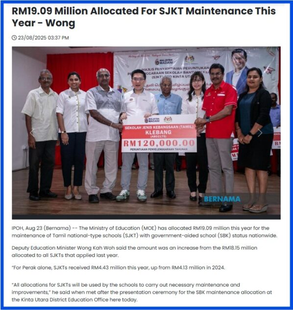 It is utter shame to openly declare a RM19 mil allocation for the improvement of physical infrastructure for an estimated 528 Tamil schools nationwide as an example of the Madani government’s commitment to Tamil vernacular education.