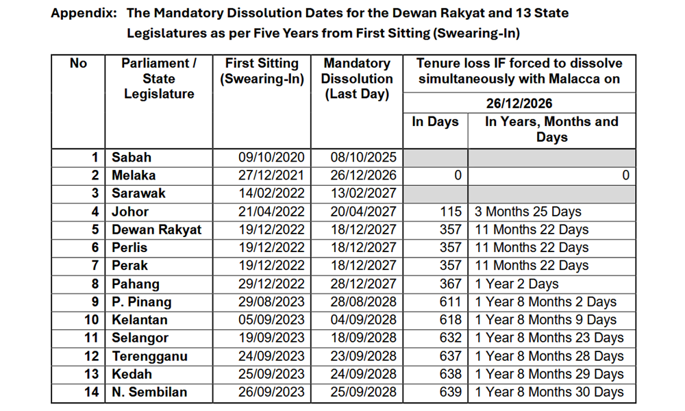 Synchronised federal and peninsula state elections mean that the next election must be held according to the earliest dissolution date, in this case, Dec 26, 2026, for Malacca.