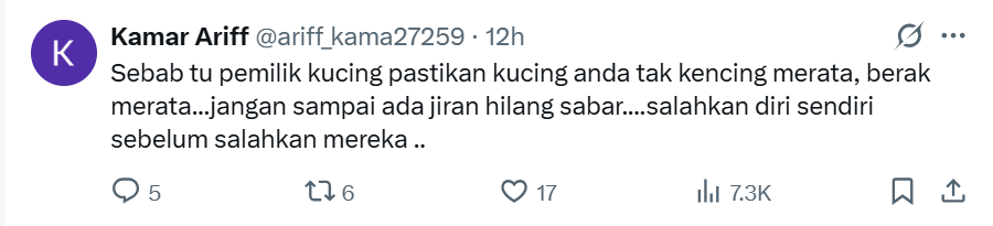 Interestingly, the animal abuser had his supporters too. @ariff_kama27259 said this was why cat owners must make sure their cats do not urinate and defecate everywhere.