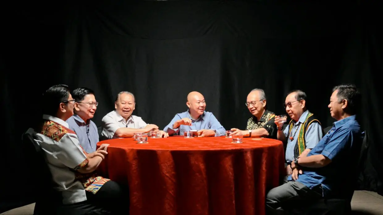 What they want: (From left) Benedick, Malanjum, Pairin, the columnist, Dompok, Jeffrey, and Gunsalam. Despite representing three different political parties among them, the six community leaders agree on ‘Sabah first’ as a goal for the elections on Nov 29. — NorthBorneoTV