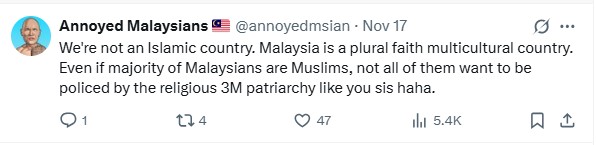 “Even if majority of Malaysians are Muslims, not all of them want to be policed by the religious 3M patriarchy like you, sis. Haha,” snubbed the self-proclaimed liberal secularist.
