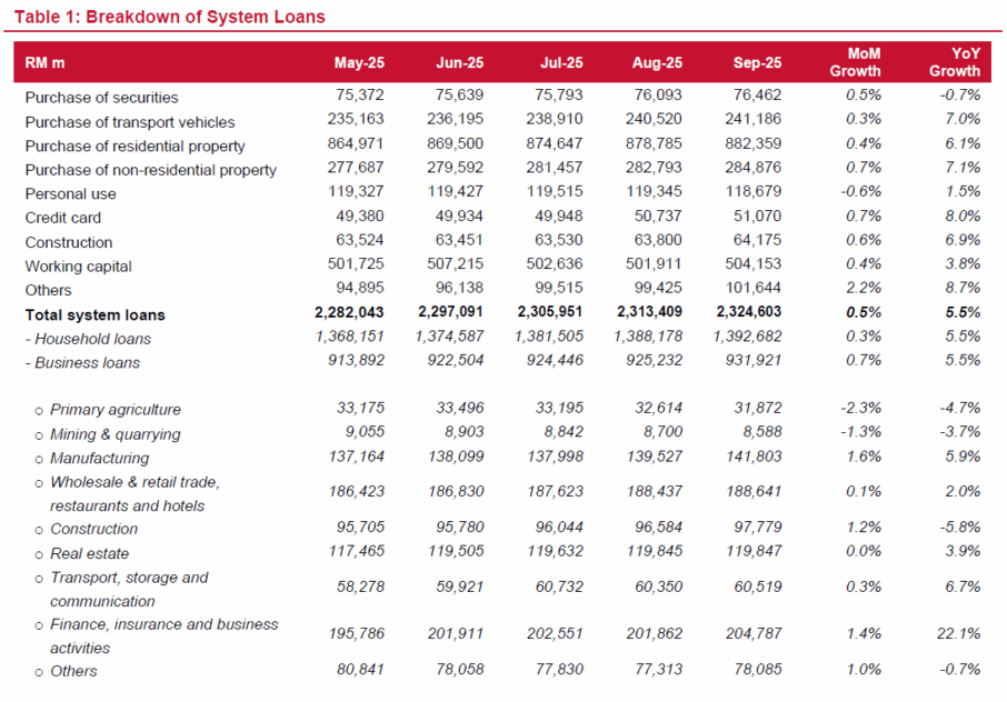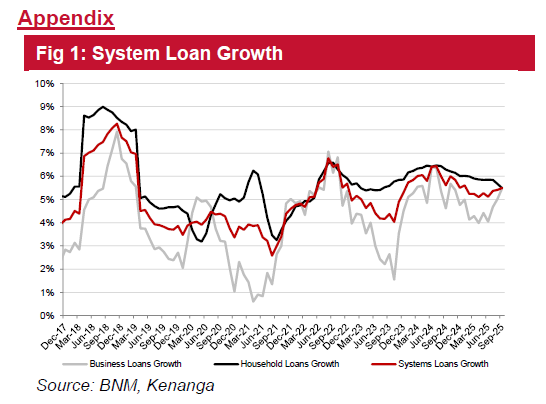 SEPTEMBER 2025 system loans grew by 5.5%, within Kenanga Research’s 5.5% target for 2025 as both household and business segments similarly expanded year-on-year (YoY).