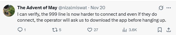 “I can verify (that) the 999 line is now harder to connect and even if they do connect, the operator will ask us to download the app before hanging up,” lamented one caller in an insinuation that TM has reduced its call centre manpower in anticipation of ‘full migration’ to the NG MERS 999 system.