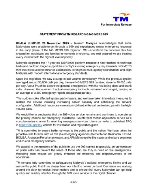 The clarification came about as TM which manages the NG MERS 999 acknowledged that some Malaysians were unable to get through to 999 or experienced slower emergency response in the early phase of the NG MERS 999 migration.