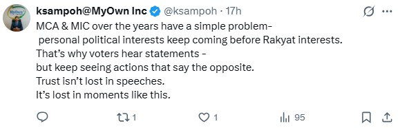 Now they’re (the Chinese community) seeing the difference and emptiness of those promises by PMX (Prime Minister Datuk Seri Anwar Ibrahim) and DAP. To mem Wee is just going for his optics, nothing to do with party or Chinese politics.